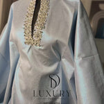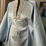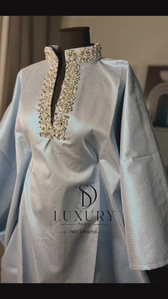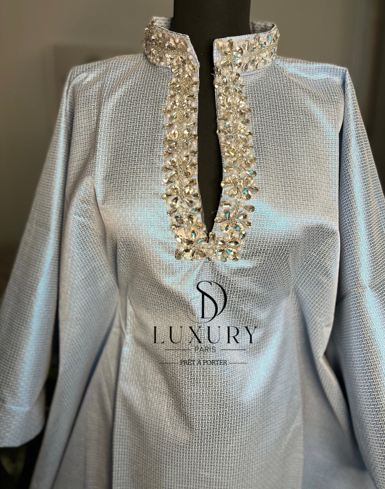 - Le haut de ce boubou se distingue par un col U, orné de cristaux. Les manches sont munit de ficelles afin de porter le boubou de deux manières : Manches longues / ou manches bouffantes.