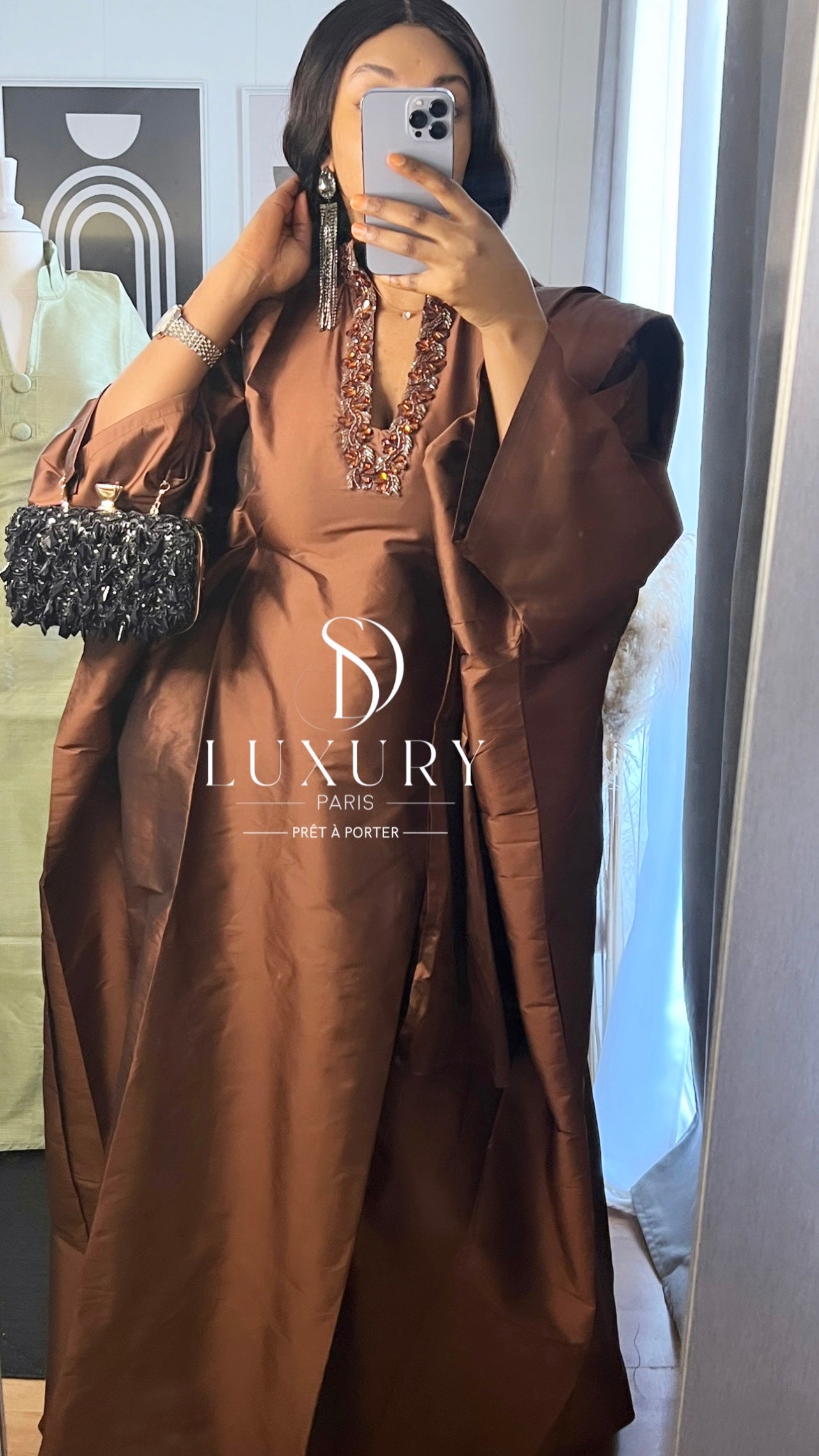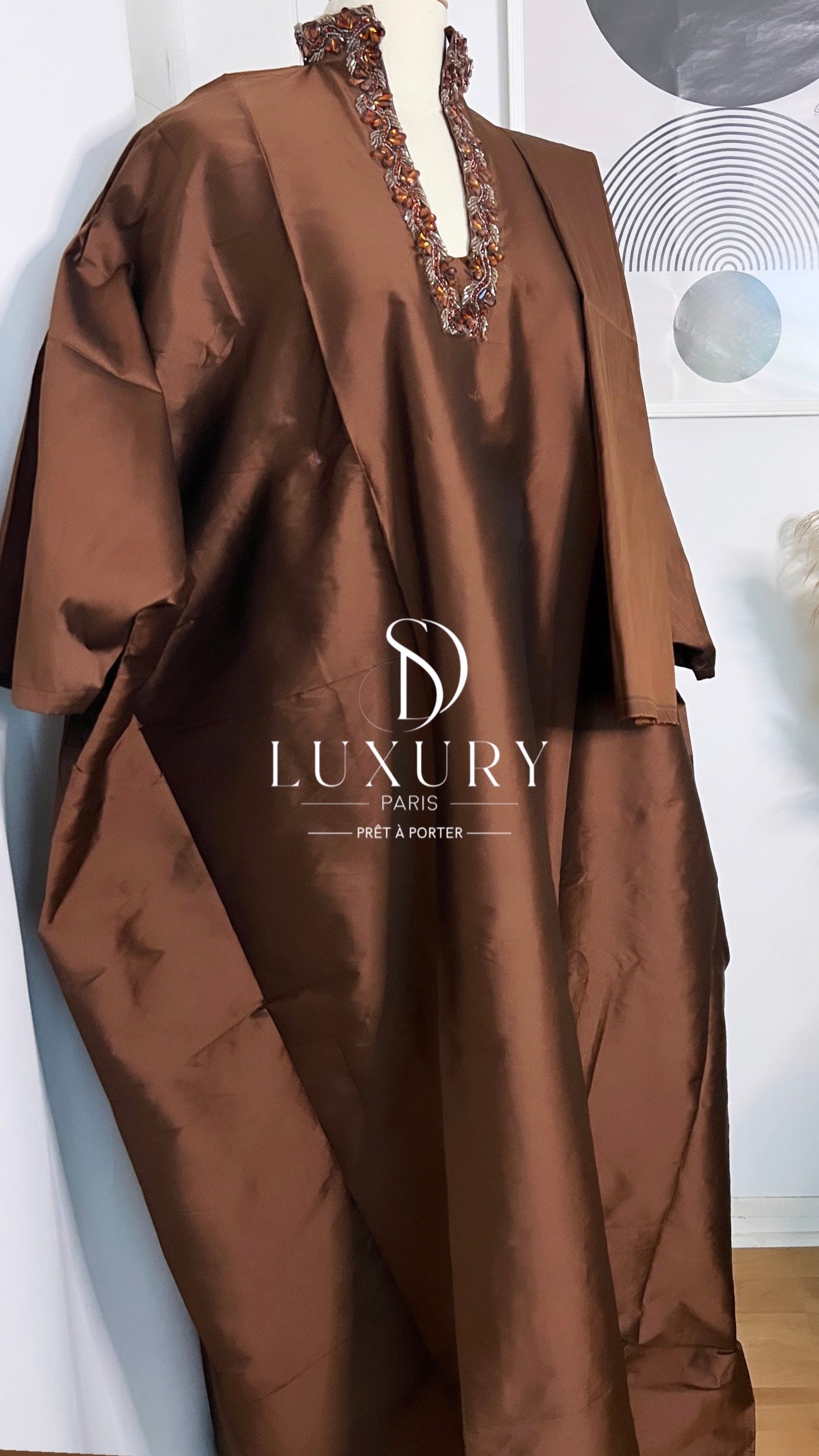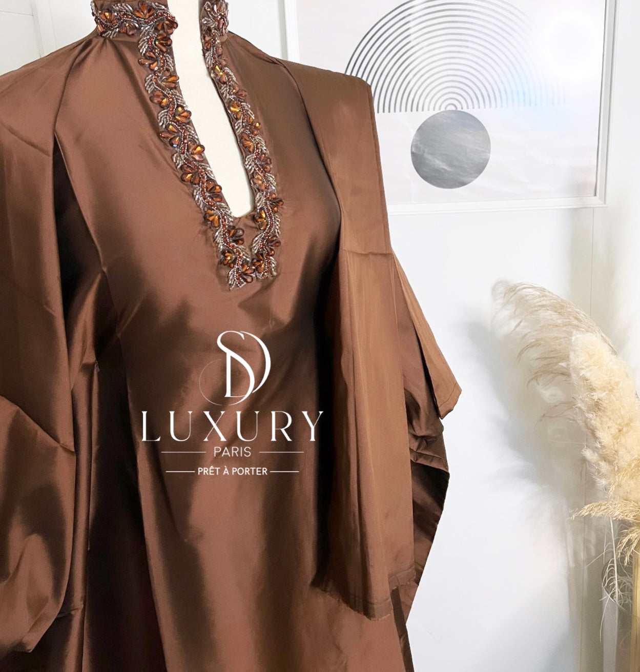 - Le haut de ce boubou se distingue par un col U, orné de cristaux.