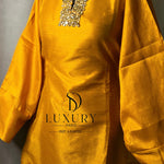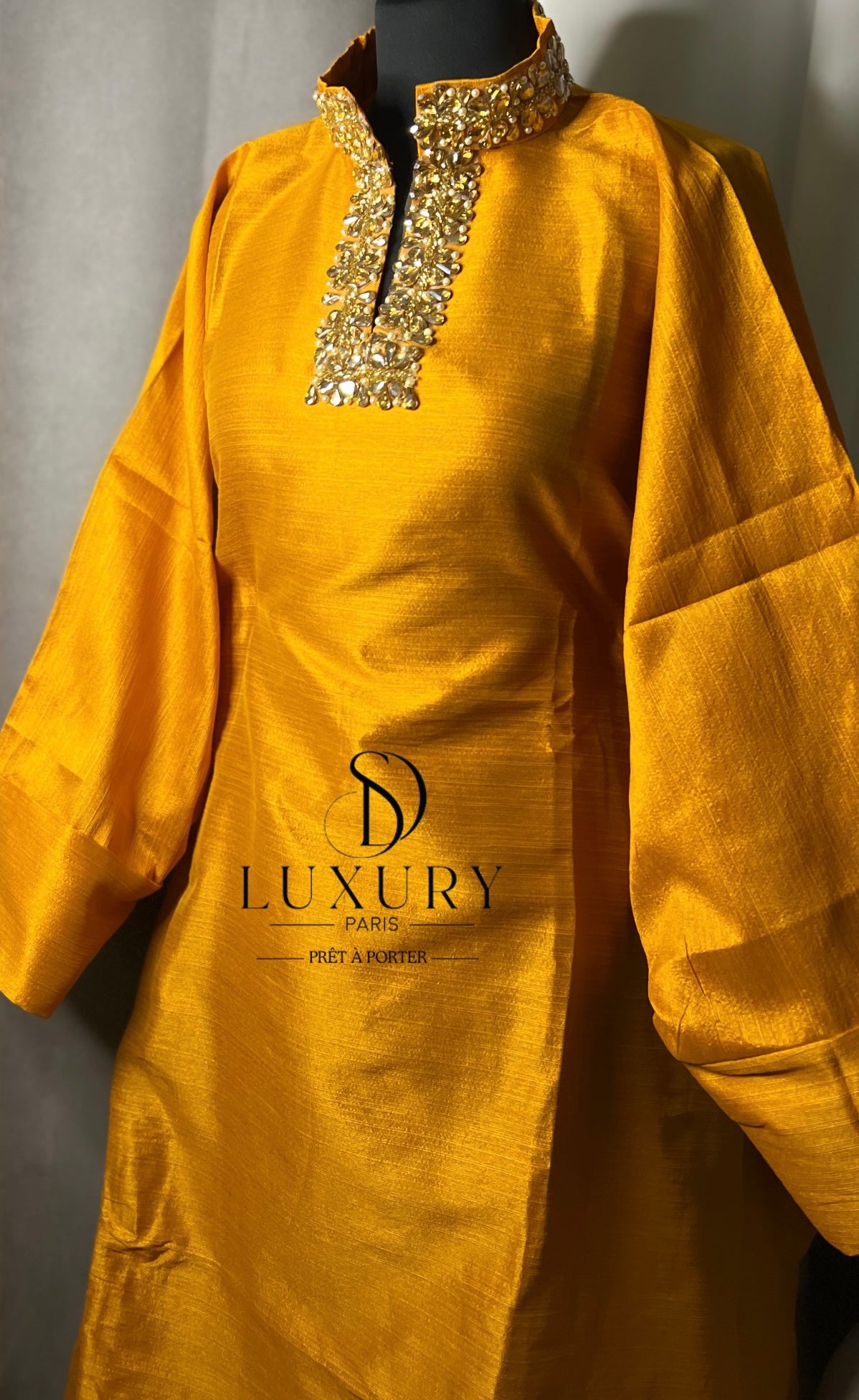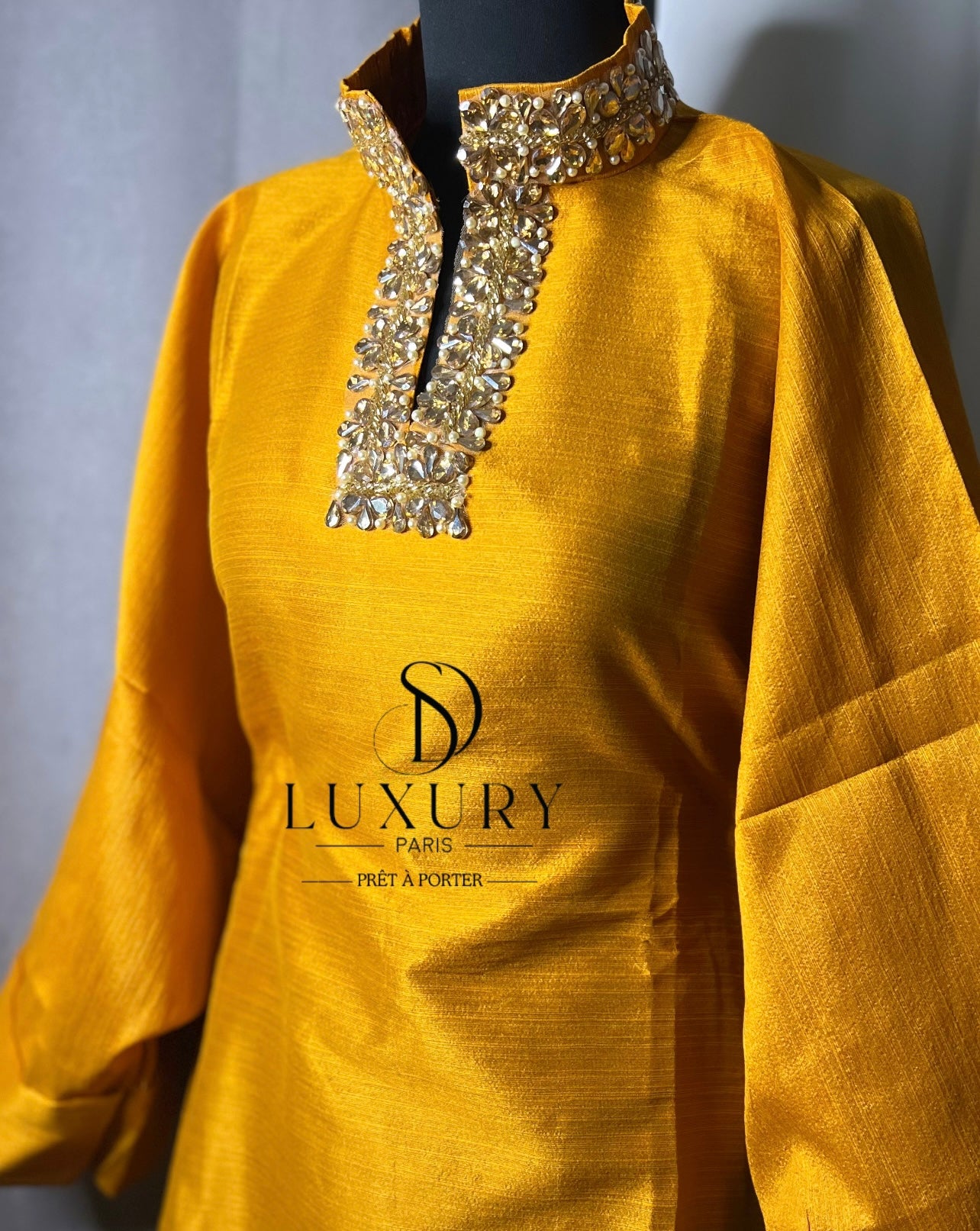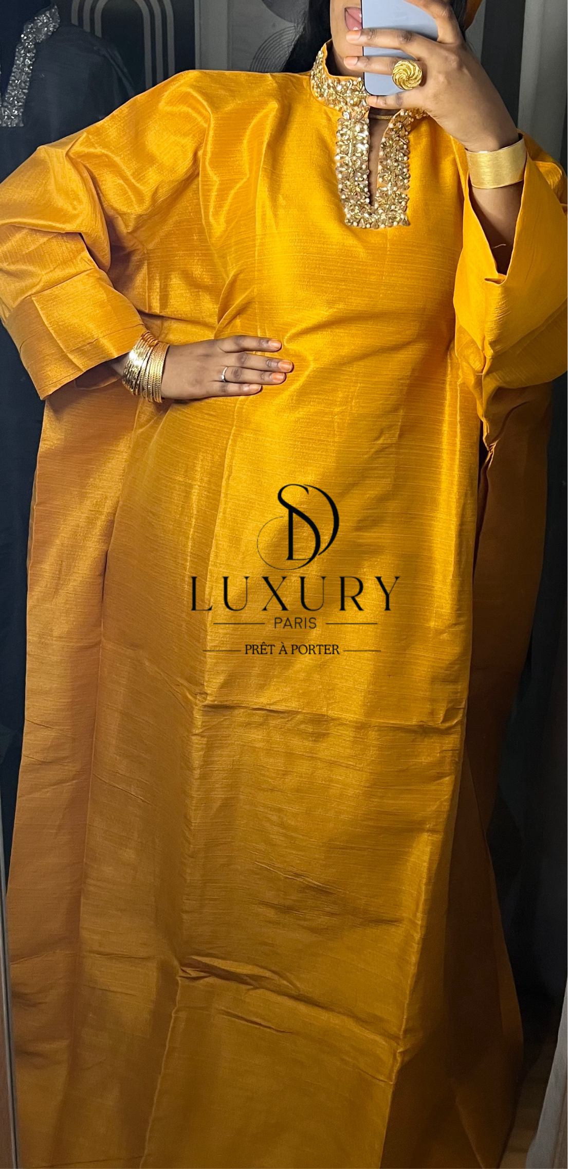 - Le haut de ce boubou se distingue par un col U, orné de cristaux.