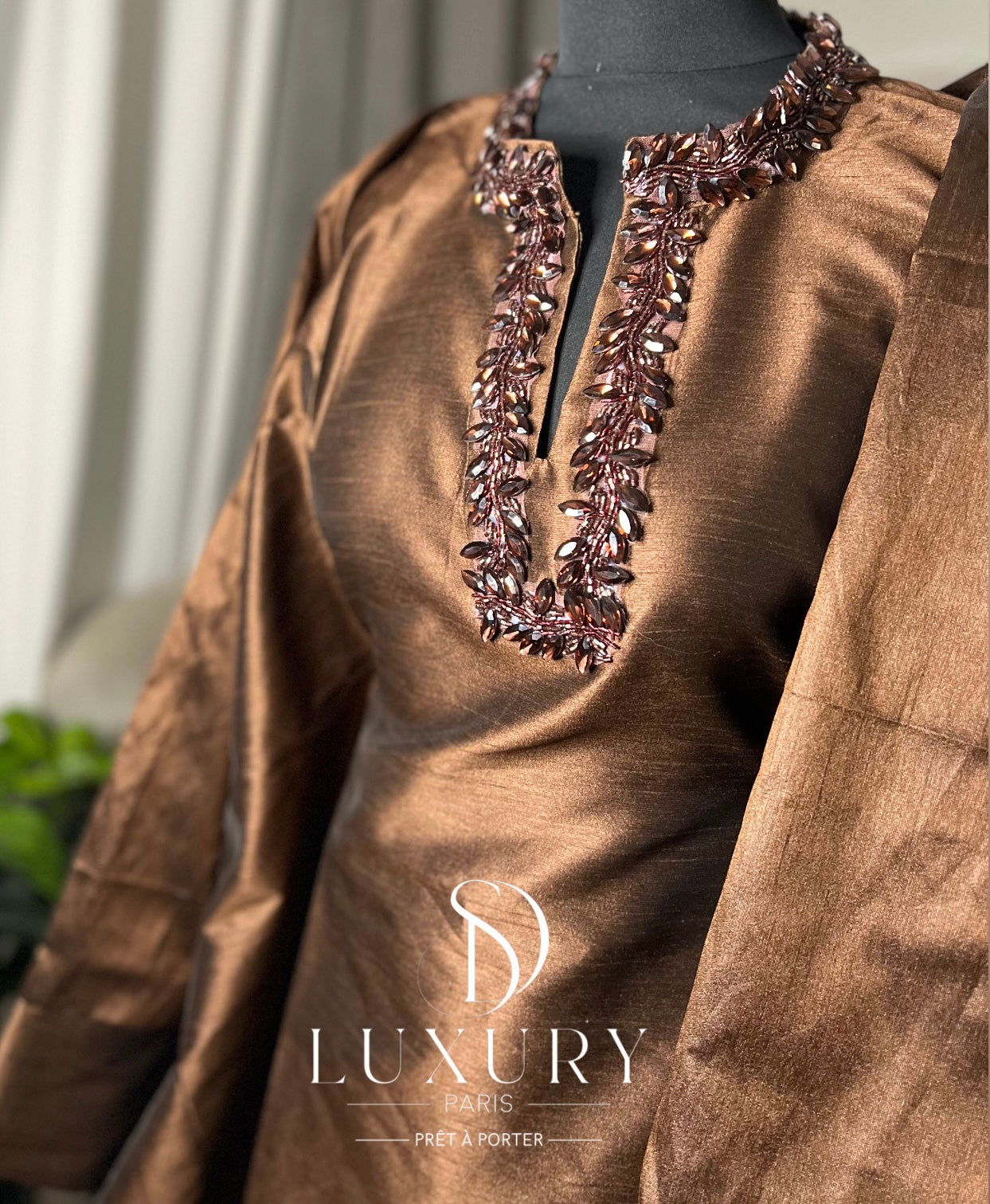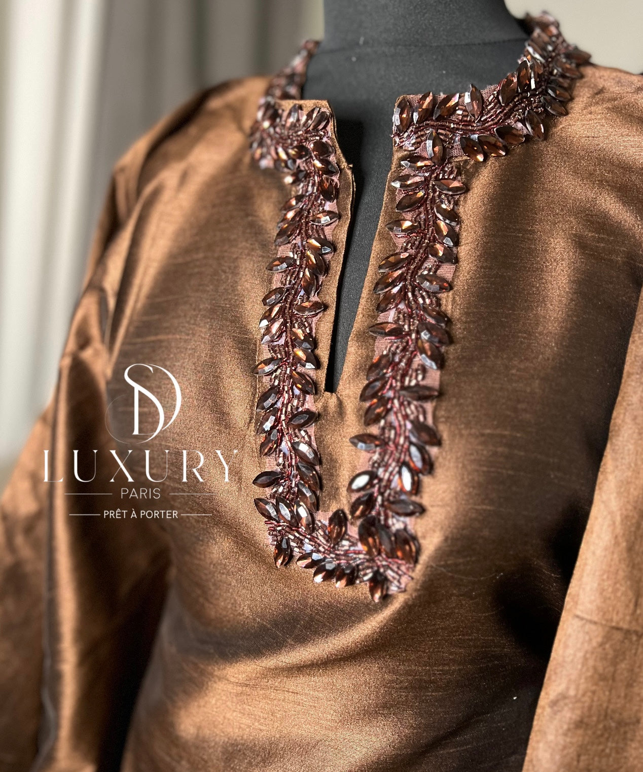 - Le haut de ce boubou se distingue par un col U, orné de cristaux.