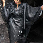 - Le haut de ce boubou se distingue par un col , orné de somptueux cristaux. Les manches sont finement travaillées et ajoutent une touche d’élégance à votre boubou.