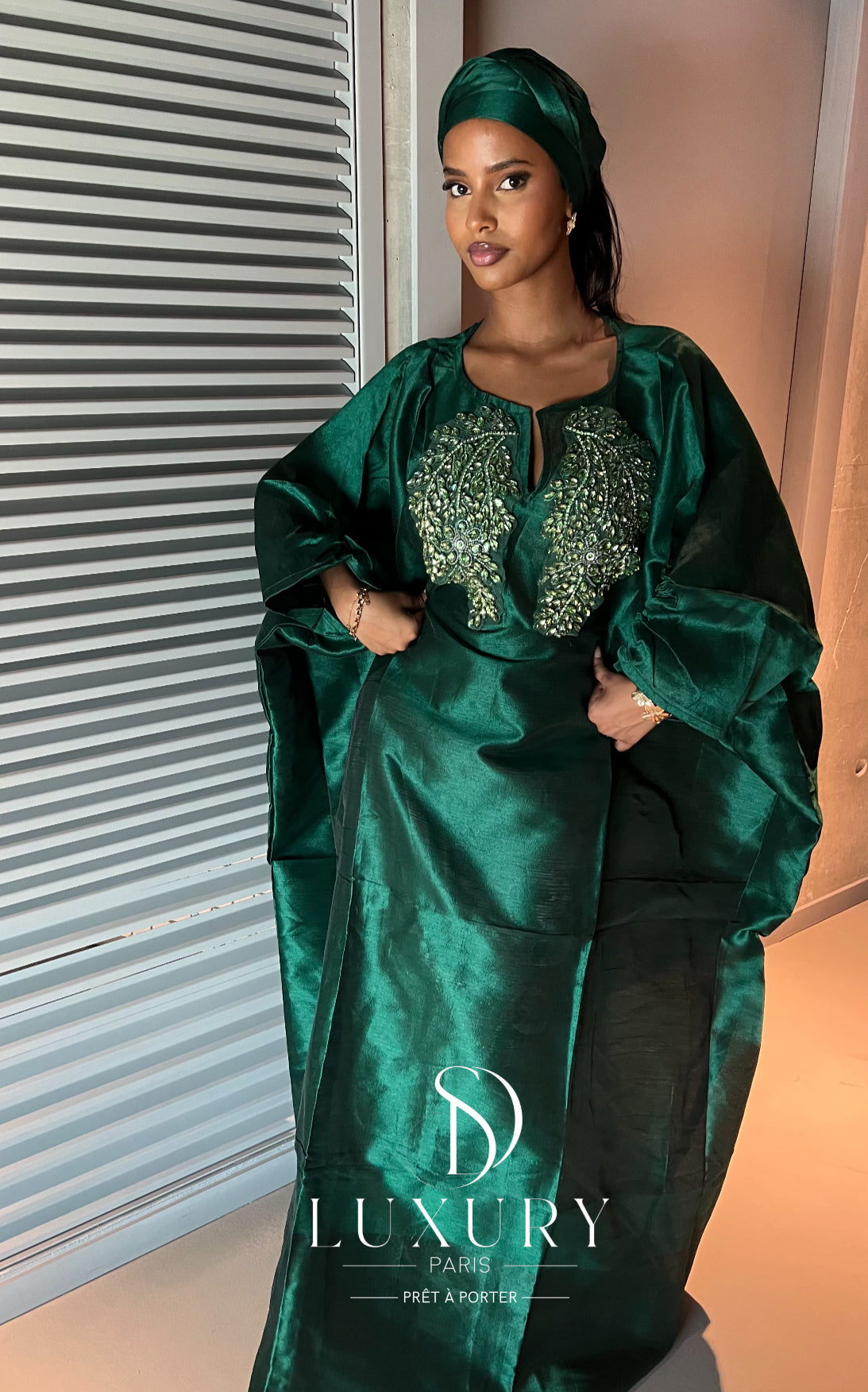 - Le haut de ce boubou se distingue par un col , orné de somptueux cristaux. Les manches sont finement travaillées et ajoutent une touche d’élégance à votre boubou.